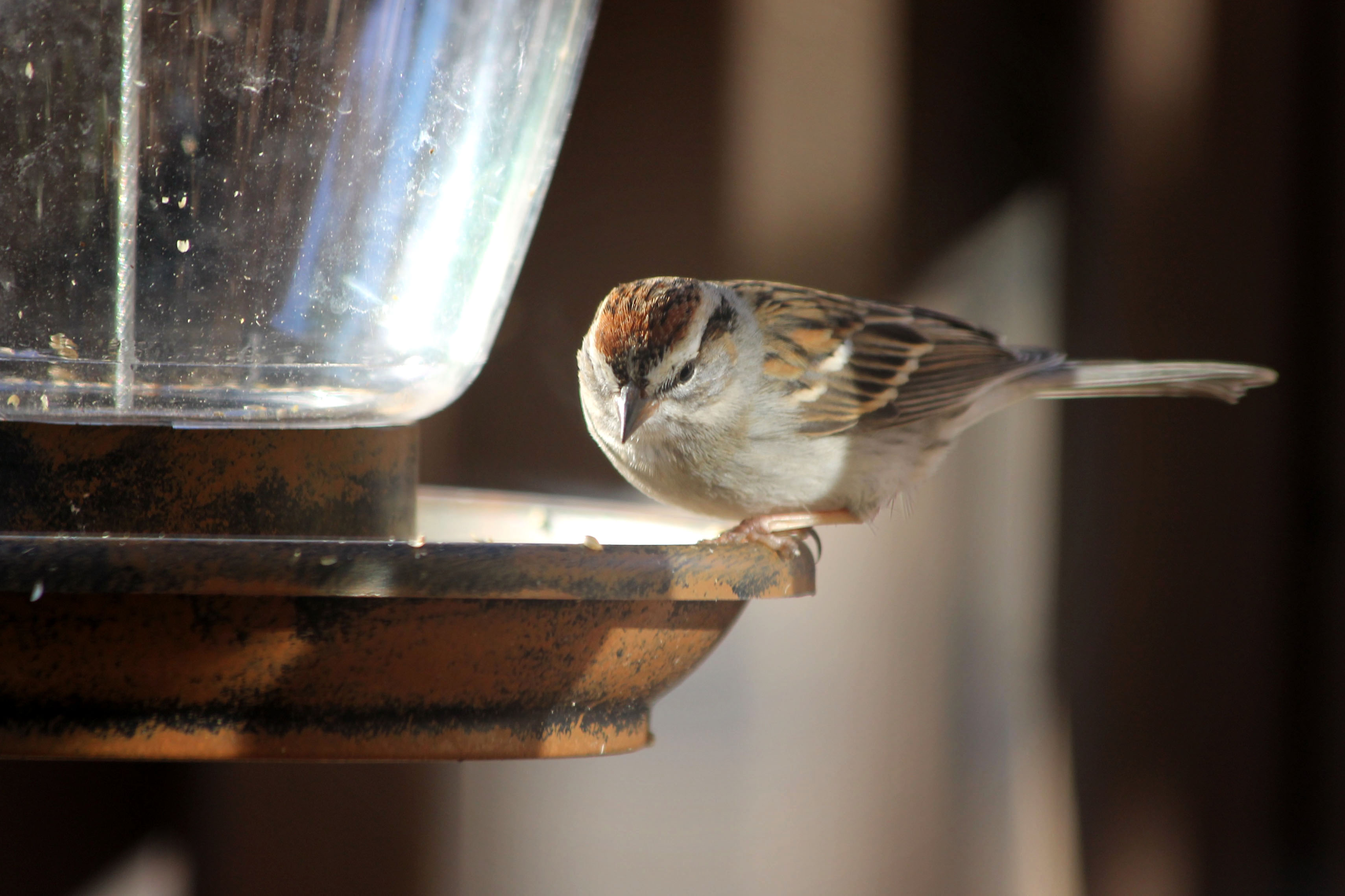 Sparrows make a lot of commotion at the feeder. If I see the feeder swinging back and forth then it’s usually a handful of sparrows dishing it out. Every now and then, one will be a lookout for the Cardinals that always swoop in to take over.